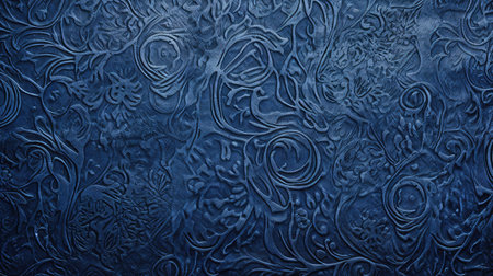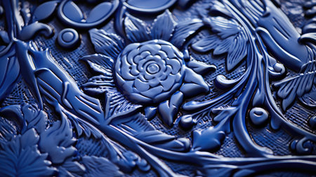 A macro photograph of an ornate, textured surface, possibly a bar of artisanal soap or a block of clay. The deep blue material is covered in intricate, embossed patterns of swirls, curls, and textures, creating a visually complex and artistic design. The lighting highlights the depth and detail of the relief.