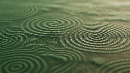 A close-up view of a zen garden's green raked sand, featuring intricate swirling spiral patterns that create a textured, calming, and meditative surface.