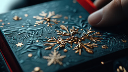 Close-up of a man's hand holding a book with gold snowflakes