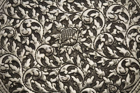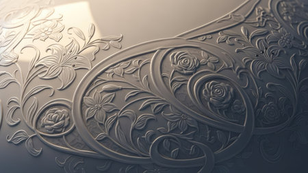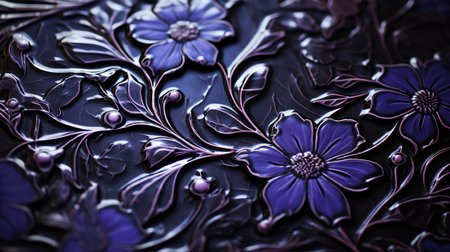 A close-up showcases a detailed floral pattern embossed on a surface. The design features various flowers and leaves, creating a decorative and artistic look. The composition highlights textured surfaces with shadows and highlights. The image may be suitable for backgrounds, design elements, and other creative purposes.