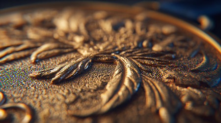 Macro detail of a gold coin with a floral pattern on it