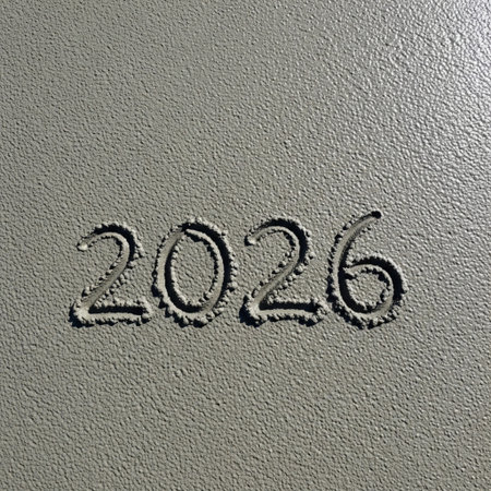 The year 2026 is displayed on a dark, textured surface with scattered water droplets. Clear detai...