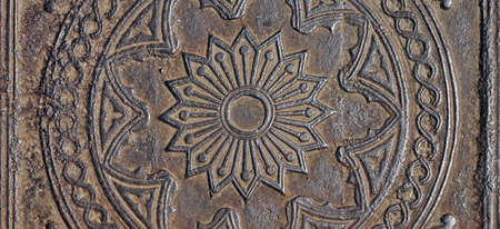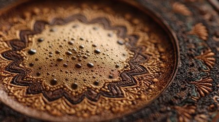 This close-up image showcases a beautifully textured antique metal surface, featuring intricate patterns and glistening water droplets, capturing timeless artistry.
