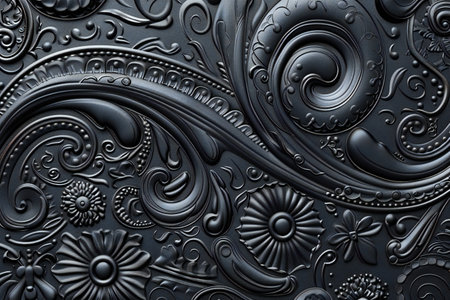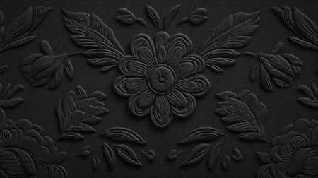 This elegant black floral pattern features intricate embossed designs, showcasing artistic craftsmanship and a sophisticated texture ideal for backgrounds or textiles.