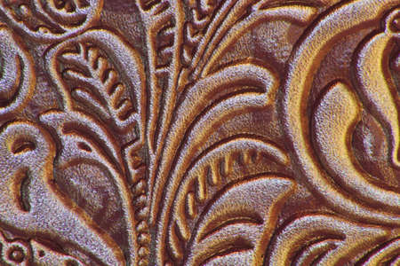 Explore the captivating details of a red floral embossed pattern on a black leather background. Ideal for use in artistic, design, or decorative projects.