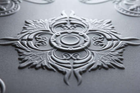 A close-up showcases a detailed floral pattern embossed on a surface. The design features various flowers and leaves, creating a decorative and artistic look. The composition highlights textured surfaces with shadows and highlights. The image may be suitable for backgrounds, design elements, and other creative purposes.