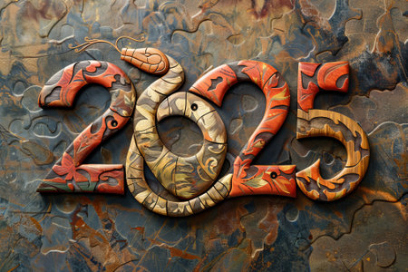 A snake is laying on a log with the numbers 2025 written in the shape of a snake