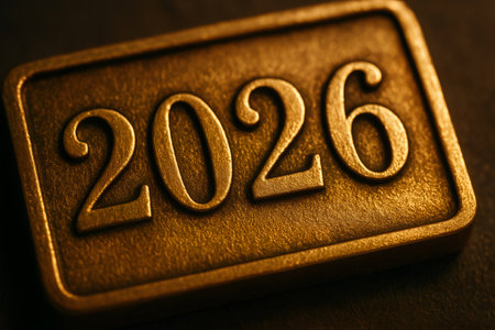 Metallic golden plate displaying the engraved year 2026, signaling the future, new beginnings, planning, and success