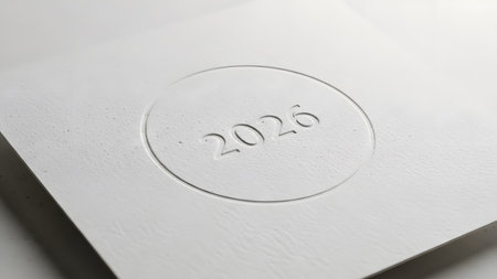Close-up of the year 2026 embossed within a circle on a textured white paper surface. Clear detai...