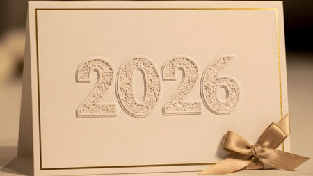 A clean white 2026 card with a gold border and a simple satin ribbon bow Clear details and vibran...