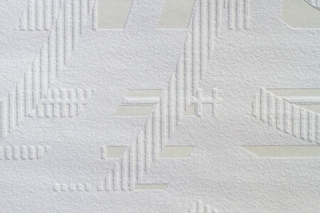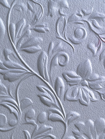 Detailed close-up of a white embossed wallpaper featuring intricate floral patterns, highlighting craftsmanship and design in interior decoration.