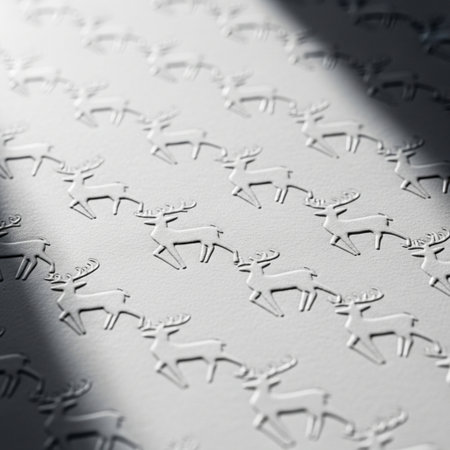A detailed embossed snowflake lattice design on matte graphite paper, highlighted by grazing side light. The image features restrained film grain and luxurious minimal negative space.