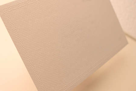 A close-up view of stacked paper or cardstock samples in neutral tones, illuminated by dramatic lighting and casting distinct shadows.