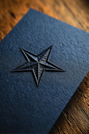 Photo-realistic mockup of a minimalist greeting card featuring a single star embossed on navy blue textured paper. The card is placed on a warm wooden surface with soft lighting.