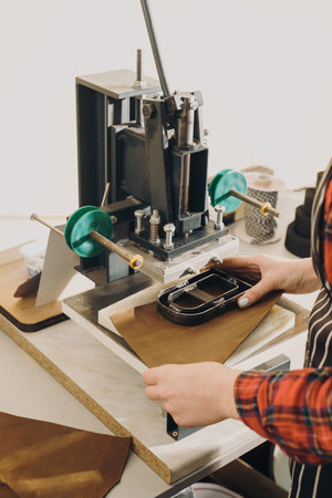 Molds for cutting leather. Cropped view of the woman hands holding leather and cutting it with special press machine. Tailoring and handicraft concept. Closeup