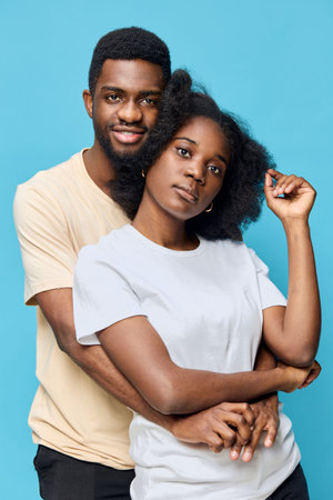 Young couple embracing against a bright blue background, showcasing happiness and love, dressed in casual light attire and exhibiting joyful expressions