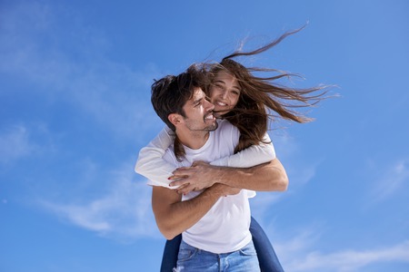 Happy couple having fun and enjoying a piggyback ride - Caucasian man and woman, best friends, sharing time together and laughing in Berlin at Tempelhof airport park - Friendship and happiness lifestyle concepts