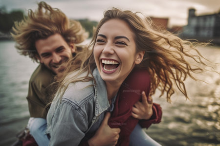 Happy loving couple Happy young man piggybacking his girlfriend while keeping arms outstretched : Generative AI