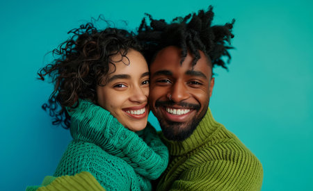 A joyful young couple shares a warm embrace and laughter against a light blue background.