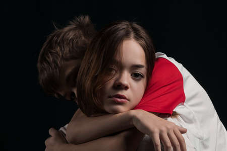 Young serious couple hugging and standing against black background