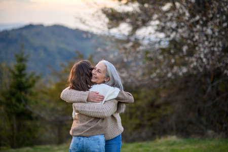 Happy senior grandmother with teenage granddaguhter hugging in nature on spring day.
