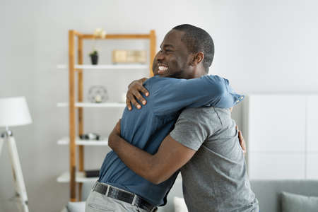 Happy African American men embracing each other, showcasing love and friendship in a joyful moment, set against a clean white background.
