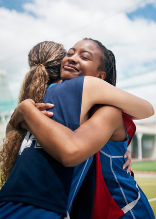 Sports, hug and women friends with teamwork, support and love for game, competition and training success in a park field. Netball, collaboration and team hugging for celebration, winning or thank you