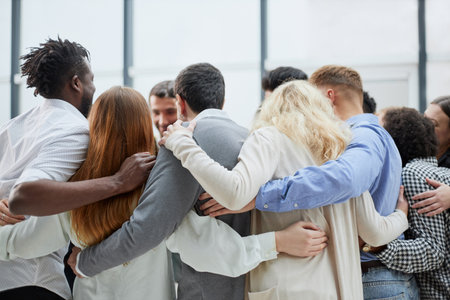 Multiethnic group of coworkers hugging at a group therapy session, overcoming problem together.