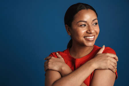 Young black woman wearing t-shirt smiling and looking aside isolated over blue wall