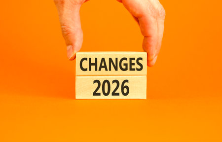 Changes 2026 symbol. Concept words Changes 2026 on beautiful wooden blocks. Beautiful orange paper background. Businessman's hand. Business and changes 2026 concept. Copy space.