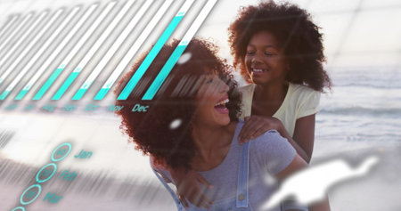 Image of data processing over african american mother and daughter on beach. Global technology, lifestyle, computing and digital interface concept digitally generated image.