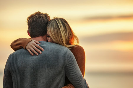 A couple enjoys a heartfelt embrace at sunset, surrounded by the beauty of nature. The warm colors portray their deep connection and love.