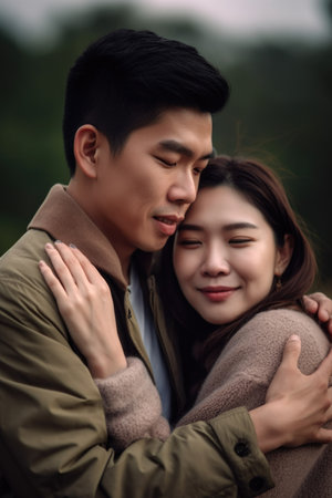 A warm hug between a young Asian couple, the man smiling as he holds his fiancae close, both enjoying the comfort of their embrace