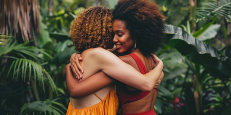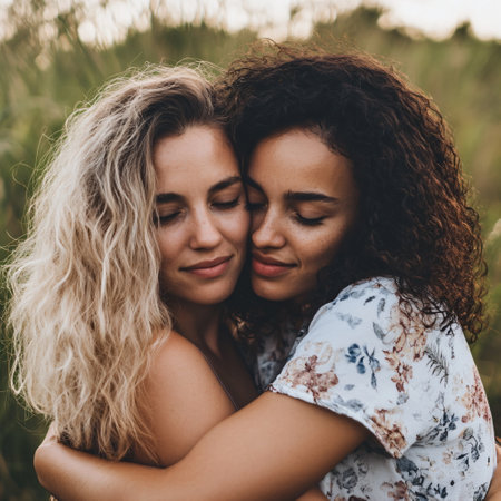 Loving embrace of two women outdoors in natural setting