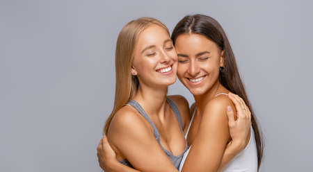 Two beautiful girl friends embracing each other on white wall in studio photo
