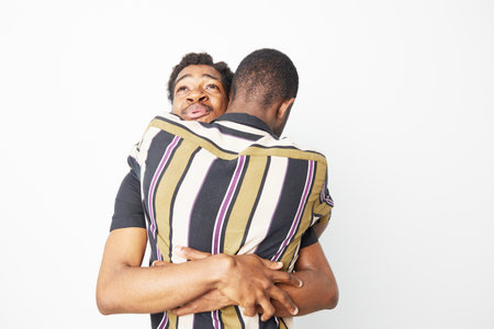 Two african men hugging each other with eyes closed and emotional connection, dark skin friends showing support and friendship in casual striped shirts on white background.
