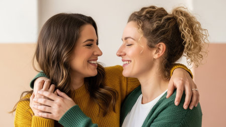 Two women are shown embracing and smiling in a well-lit indoor setting. They are wearing casual clothing, with one in a yellow sweater and the other in a green cardigan. The composition suggests a close bond, emphasizing happiness. The image could be used in various commercial and editorial contexts related to relationships and lifestyle themes.