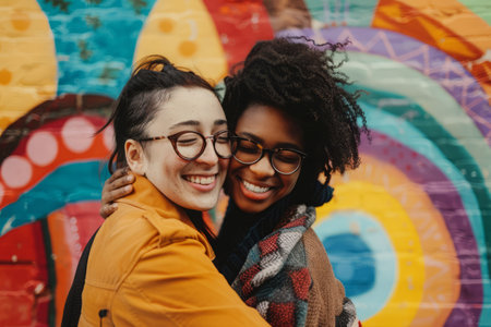 Two women standing in front of a vividly colorful wall, holding each other in a warm embrace, showing love and unity.