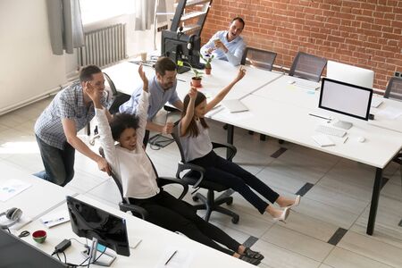 Happy multiracial colleagues group having fun together, riding on chairs in office, diverse excited office workers enjoying break, laughing, engaged activity, having funny competition top view