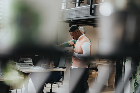 In a contemporary office setting, multiple professionals engage in various tasks at their desks. Some collaborate, while others focus on their computers, surrounded by natural light and greenery.