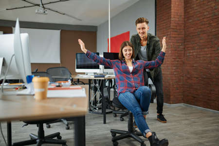 Young multiethnics startup business team of software developers having fun while racing on office chairs