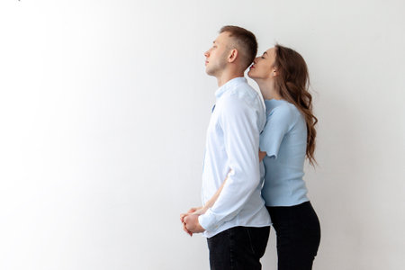 young couple in love stands and hugs against the background of white isolated wall, woman kisses man on the back of the head, copy space