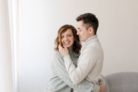 Embracing man and woman in sweaters standing in embracing at home being in love