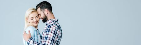 panoramic shot of beautiful young couple embracing isolated on grey with copy space