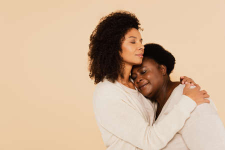 african american adult daughter hugging middle aged mother with closed eyes isolated on beige