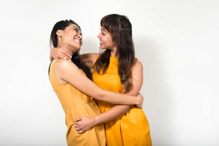 Happy lesbian couple embracing in isolated white background, love and happiness concept