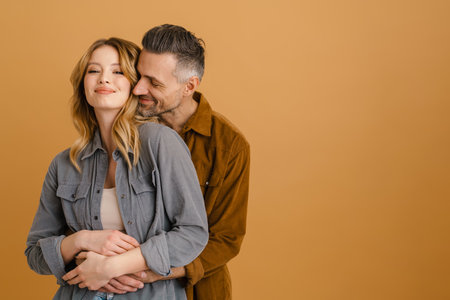 Couple Embracing in a Candid Moment of Affection Against a Simple Background