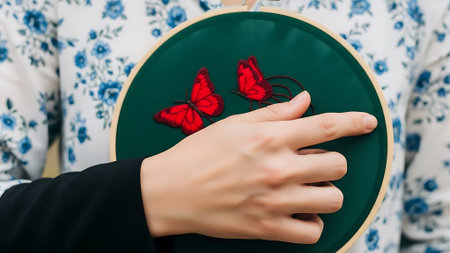 A hand holding an embroidery hoop with red butterflies on green fabric