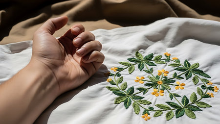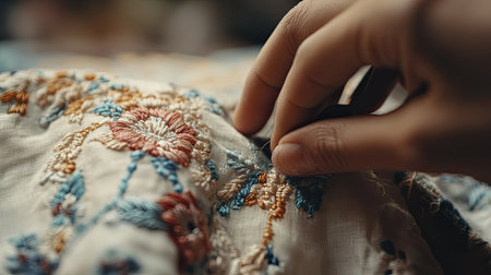 This close-up image captures a hand delicately embroidering floral patterns on fabric. The vibrant threads and intricate designs showcase the beauty of manual artistry.