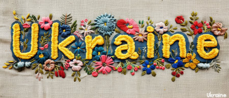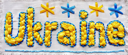 Colorful Ukraine Embroidery with Yellow and Blue Threads. Traditional Handicraft, Cultural Heritage.